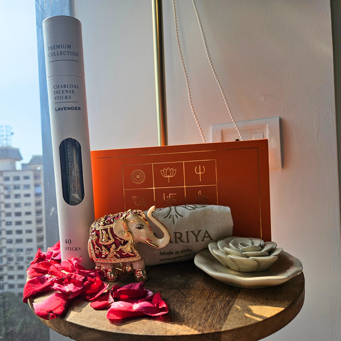 Incense Sticks with Ceramic Rose Incense Holder, Pearl Enamel Trunk-up Elephant & Dry Fruit Pouch