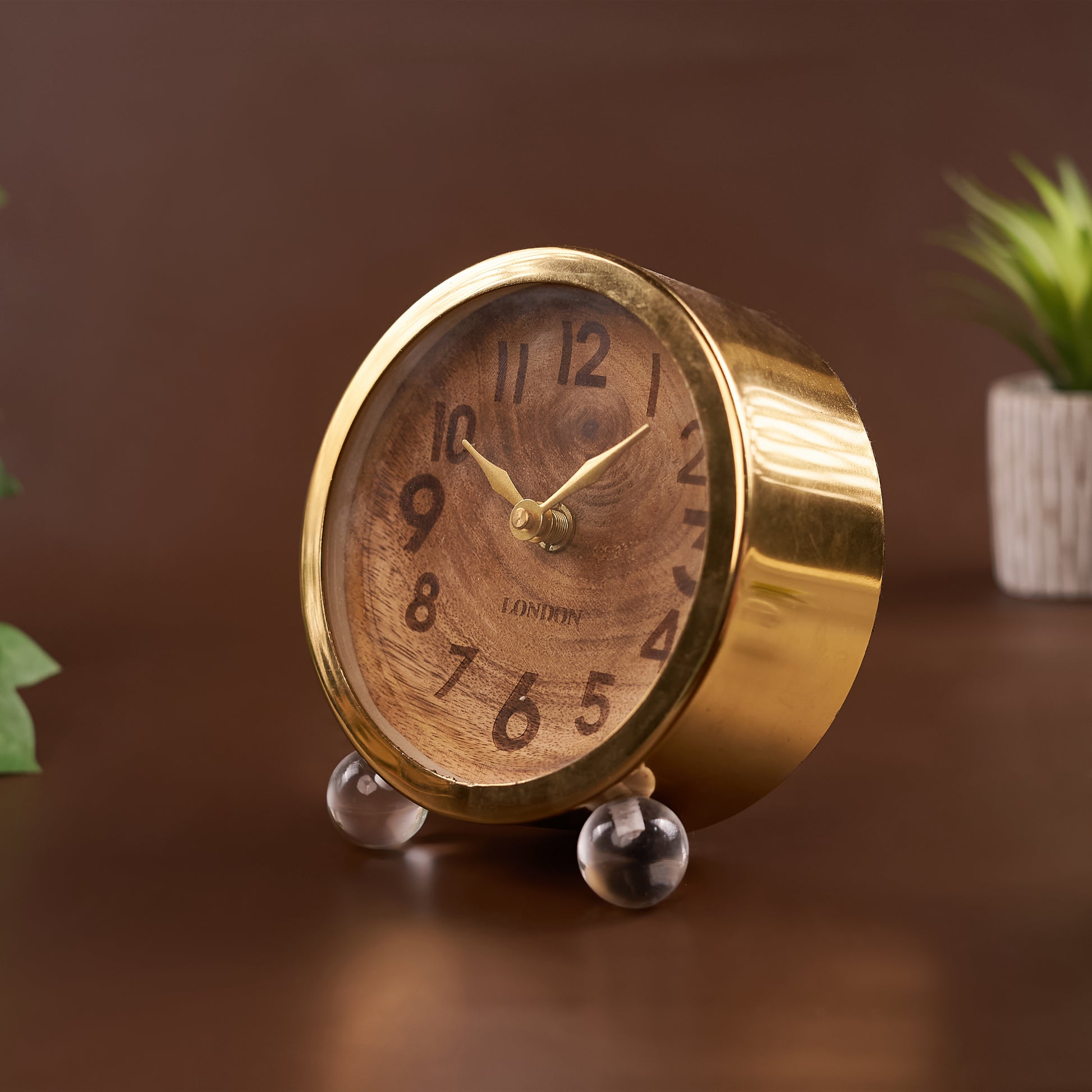 Round Antique-Look Table Clock with Wooden Dial and Brass Case - Timeless Elegance for Your Space