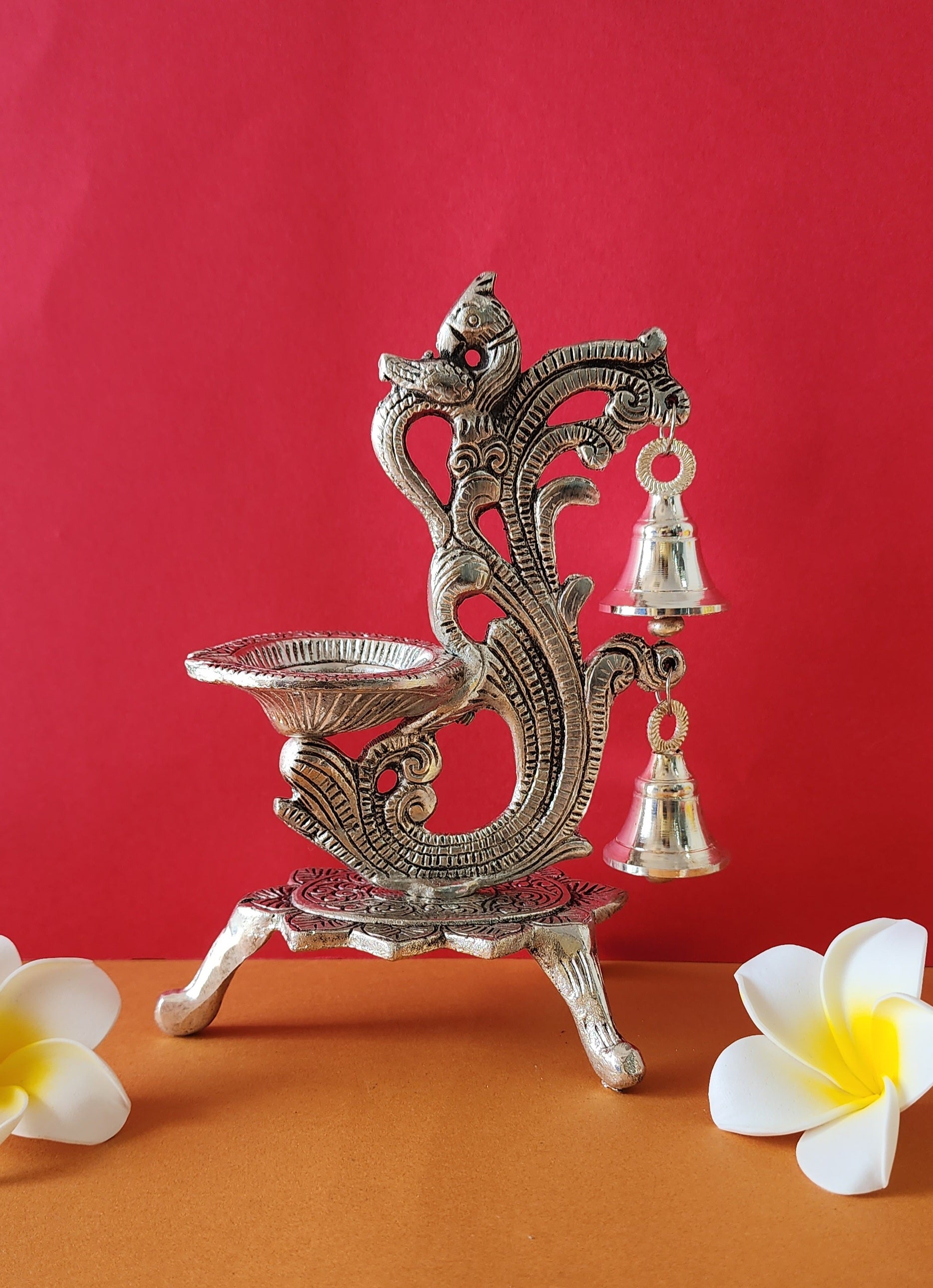 This Silver Diya Stand features an intricate peacock design and a bell, making it a perfect blend of beauty and functionality for your sacred space.